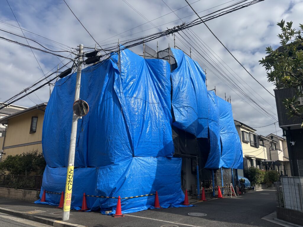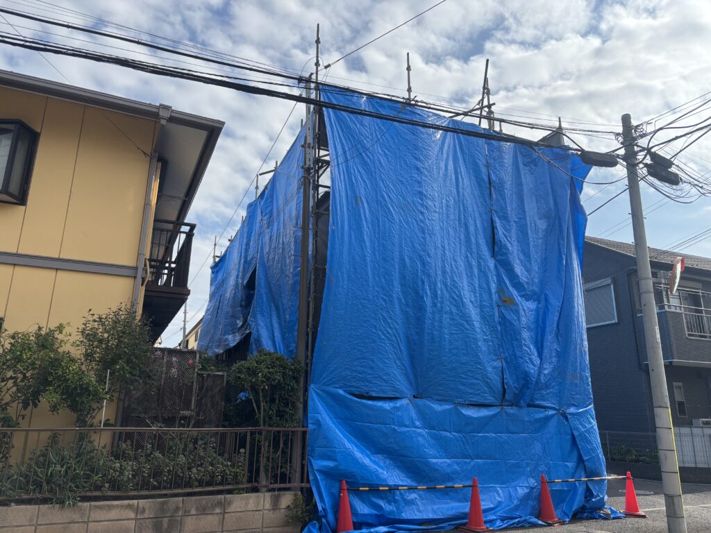 それと、近隣の方々にお水が飛ばない様にブルーシートも欠かせません。