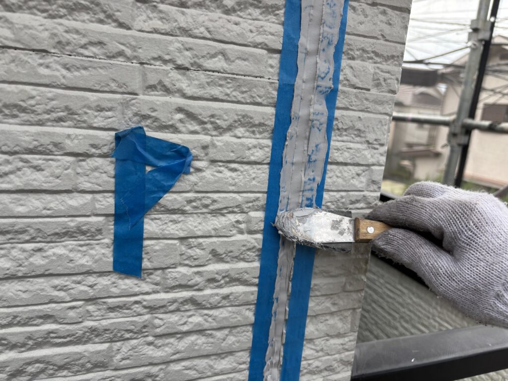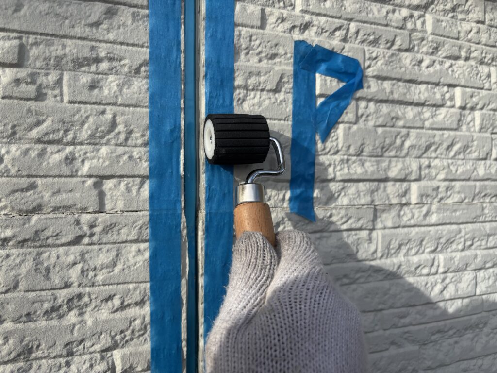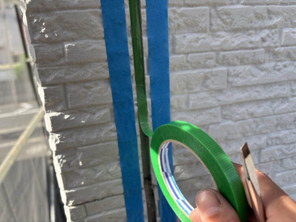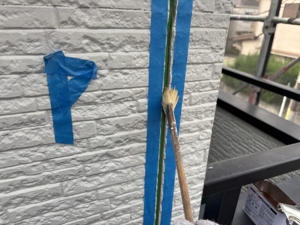 ボンドブレーカー(緑色のテープ、これにシーリング材は接着しない※写真)を目地底に貼り、